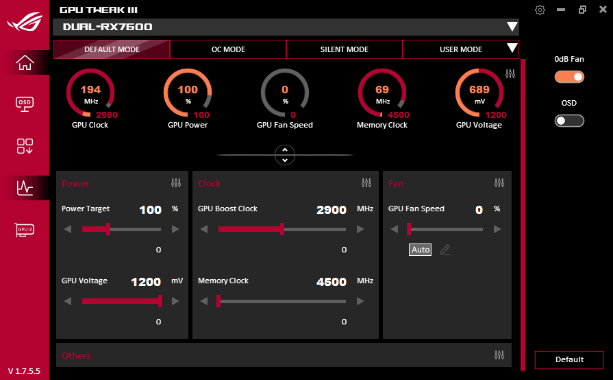 Asus DUAL RX 7600 08G V2 GPU Tweak III; Default mode