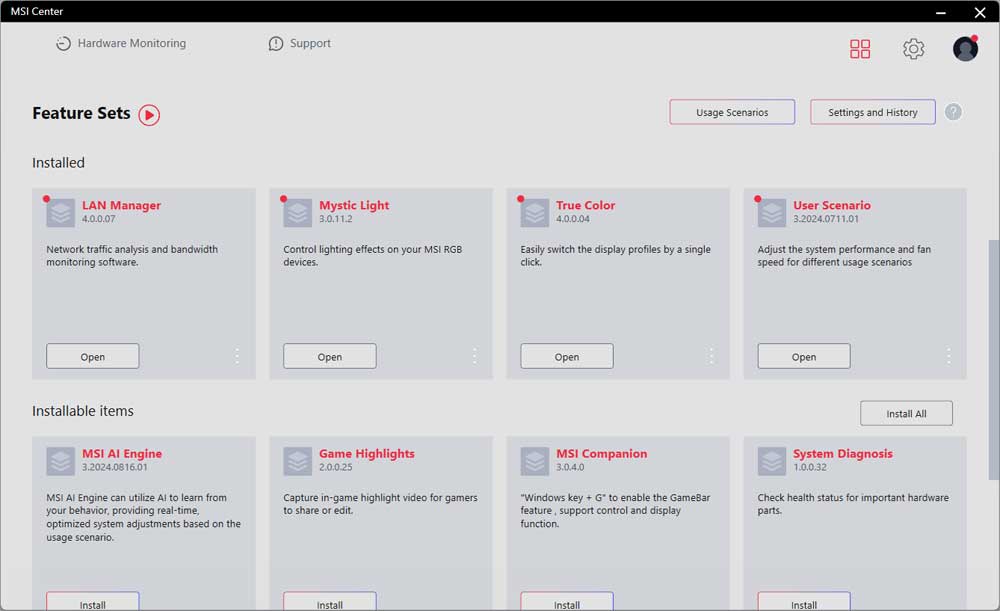 Az MSI Center-ben kiválaszthatod, mely eszközöket szeretnéd használni, majd külön-külön telepítheted azokat.