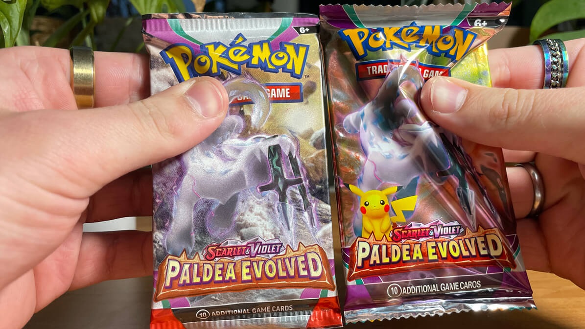 Amellett, hogy a hamis Scarlet & Violet: Paldea Evolved csomag más nyomtatással és teljesen más textúrával rendelkezik, a kártyák is sokkal lazábban vannak belecsomagolva. Mindkét hüvelykujjammal nagyjából ugyanolyan erőt fejtettem ki, de míg az eredeti booster alig deformálódik, addig a hamis pakli csomagolása teljesen felgyűrődik.