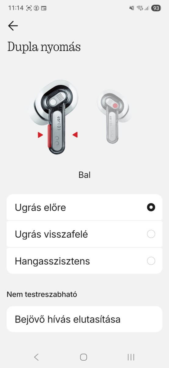 Az Ear (3) vezérlése az egyszerűség és az okos testreszabási lehetőségek kombinációja. A fülhallgatók csípéses gesztusokat használnak — vagyis a fülhallgató szárának ujjak közé való nyomását. Egy csípés szünetelteti és elindítja a zenét, vagy fogadja a hívást. A dupla csípés a következő számra ugrik, a tripla visszalép, a hosszú csípés pedig az ANC és az átláthatósági módok között vált. A Nothing X alkalmazásban pontosan beállíthatod, hogy melyik művelet mit csináljon.